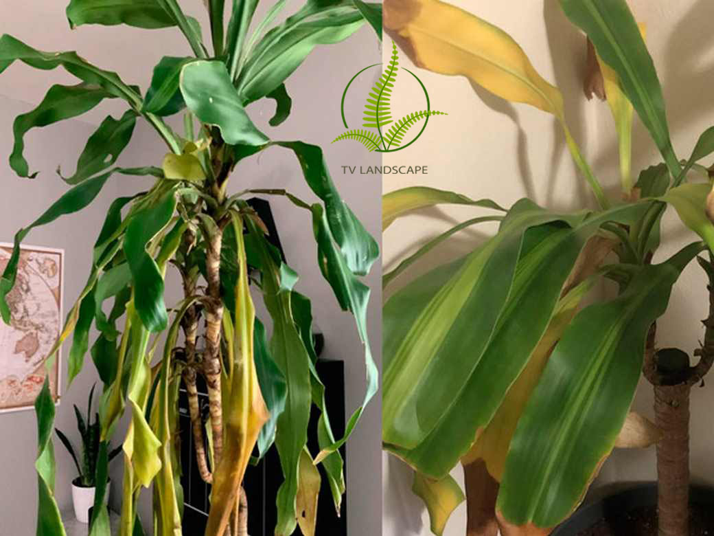 Nguyên nhân có thể do tiếp xúc quá nhiều với ánh nắng trực tiếp từ mặt trời. Hoặc bị thừa phân bón. Nếu tình trạng này xảy ra, bạn cần cho cây vào nơi râm mát, tránh ánh nắng gay gắt và giảm lượng phân bón. Từ đó có thể thấy rằng không đặt cây trên bệ cửa sổ hoặc nơi có ánh nắng trực tiếp. Nó sẽ cháy và lá sẽ chuyển sang màu vàng rồi sau đó chuyển sang màu nâu.