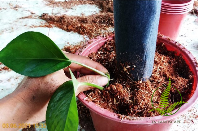 Cần làm thêm giàn leo hoặc cắm cọc để cây trầu bà có giá leo, nếu không thì để cây trầu bà leo bám trên một thân cây khác.