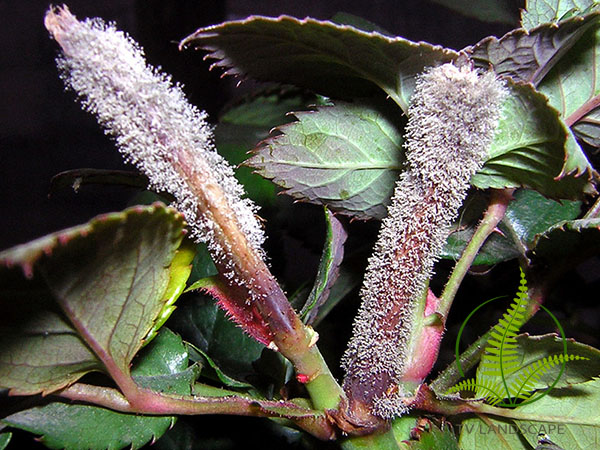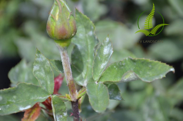 Xuất hiện bào tử trắng như phấn bám lên lá, chồi non, nụ hoa. Xin đừng trông nó đẹp mà lầm, không phải tuyết hay sương bám trên cây đâu, là nấm bệnh đấy. Nếu để lâu, nấm bám dày sẽ ngăn cản quang hợp của lá. Lá cây sẽ rụng hàng loạt và cây chết dần.