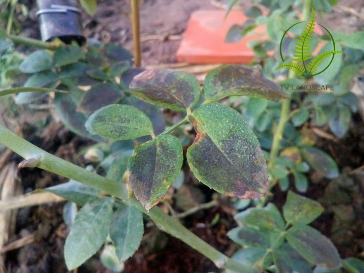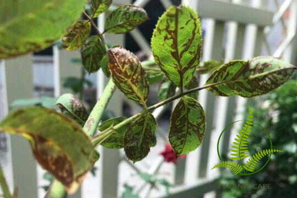 Xuất hiện các vết loang màu nâu tím dọc theo gân lá. Lâu ngày các vết thâm này sẽ chạy vào thân và lan dần xuống gốc. Bệnh chủ yếu tấn công vào lá cây hoa hồng. Khi bệnh biến chuyển nặng lá cây héo và rụng hàng loạt, làm cây không thể quang hợp và chết.