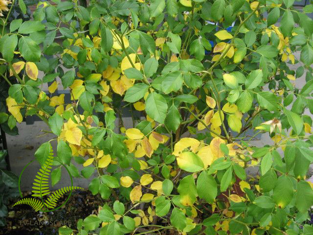 Lá bị vàng đều, héo dần và rụng đi. Đây không hẳn là bệnh, mà chỉ là biểu hiện của cây khi không được đáp ứng đủ nhu cầu.